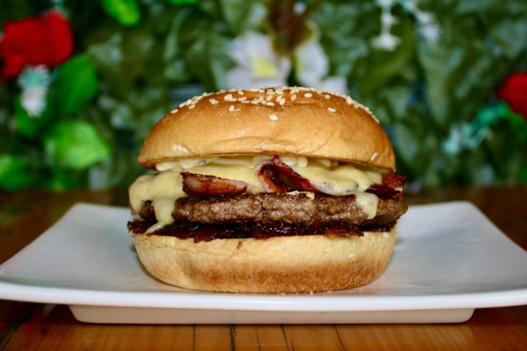 Cheeseburger in a seeded brioche with bacon & a caramelised onion chutney, dressed with garlic mayo. Served with chips & salad